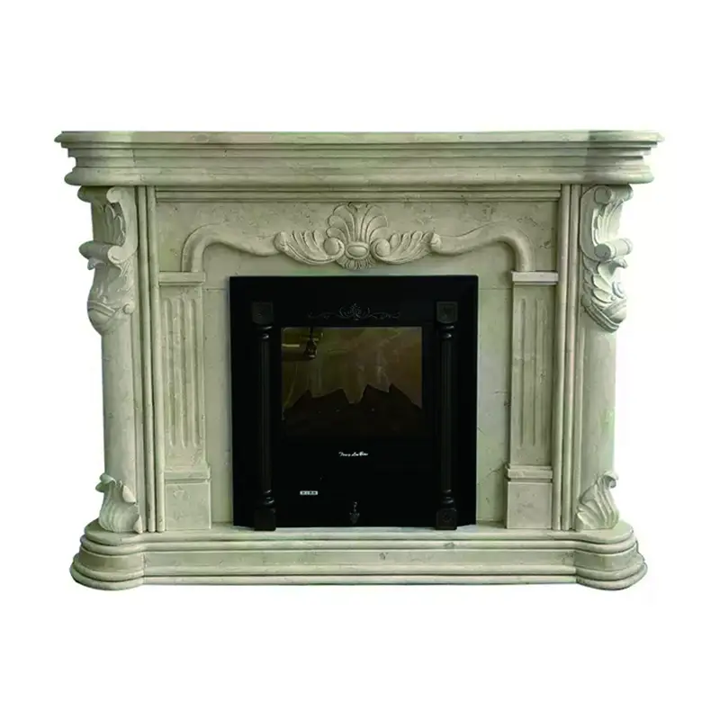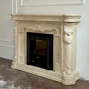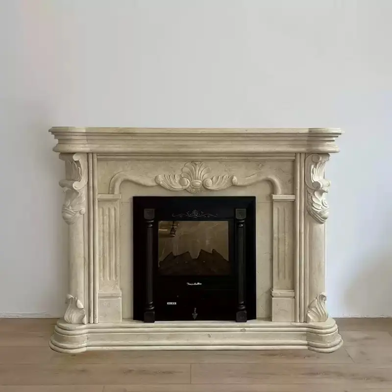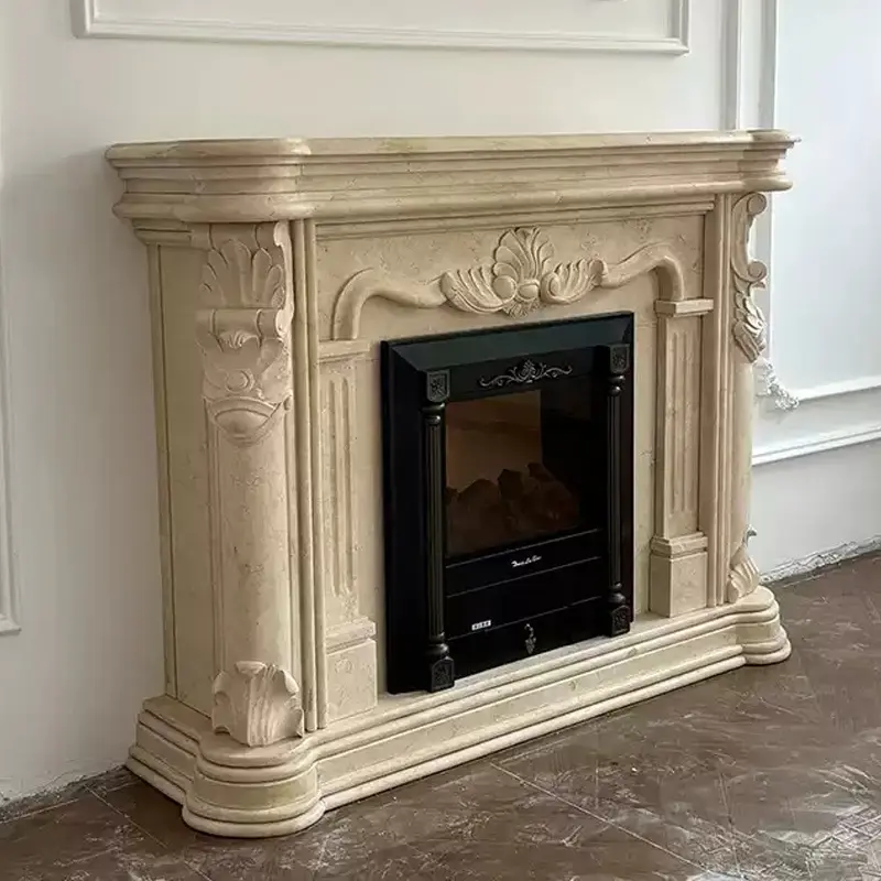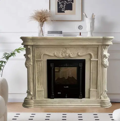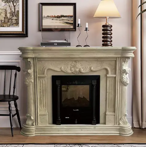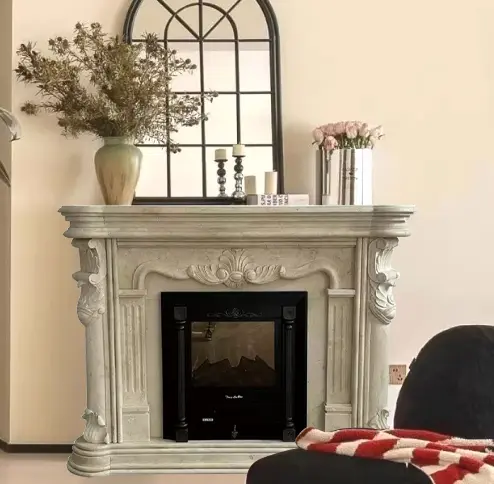 Custom-made marble fireplace mantel with natural stone, French and European style carvings, indoor living room, Guanxuan decorative cabinet and ornaments.