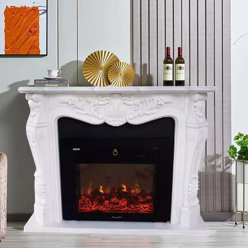 European-style white marble and Dali stone fireplace mantel, imitation heating, simple carved TV cabinet, European-style decorative corner entrance hall.
