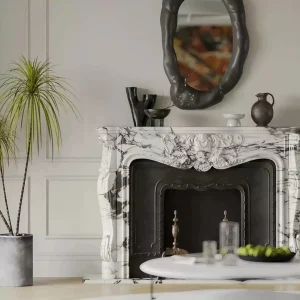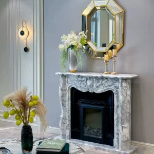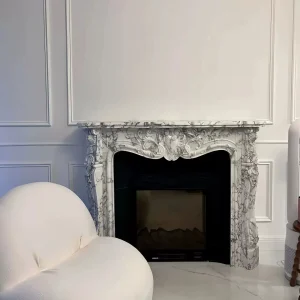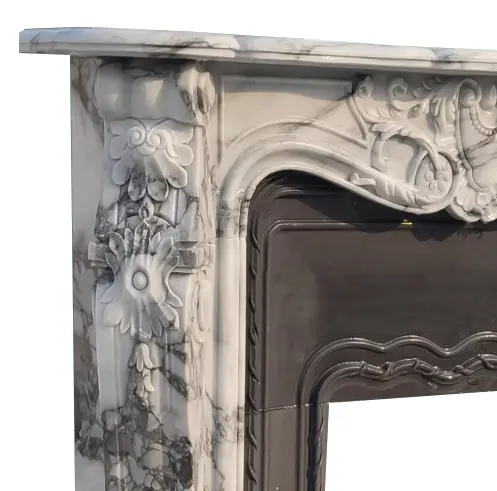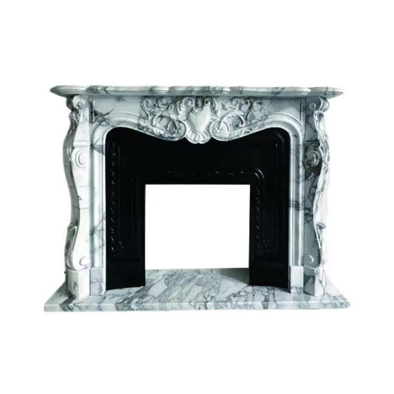 Natural marble European white rice fireplace stand with European decorative carving. Customized stone carving cabinet for the villa living room.