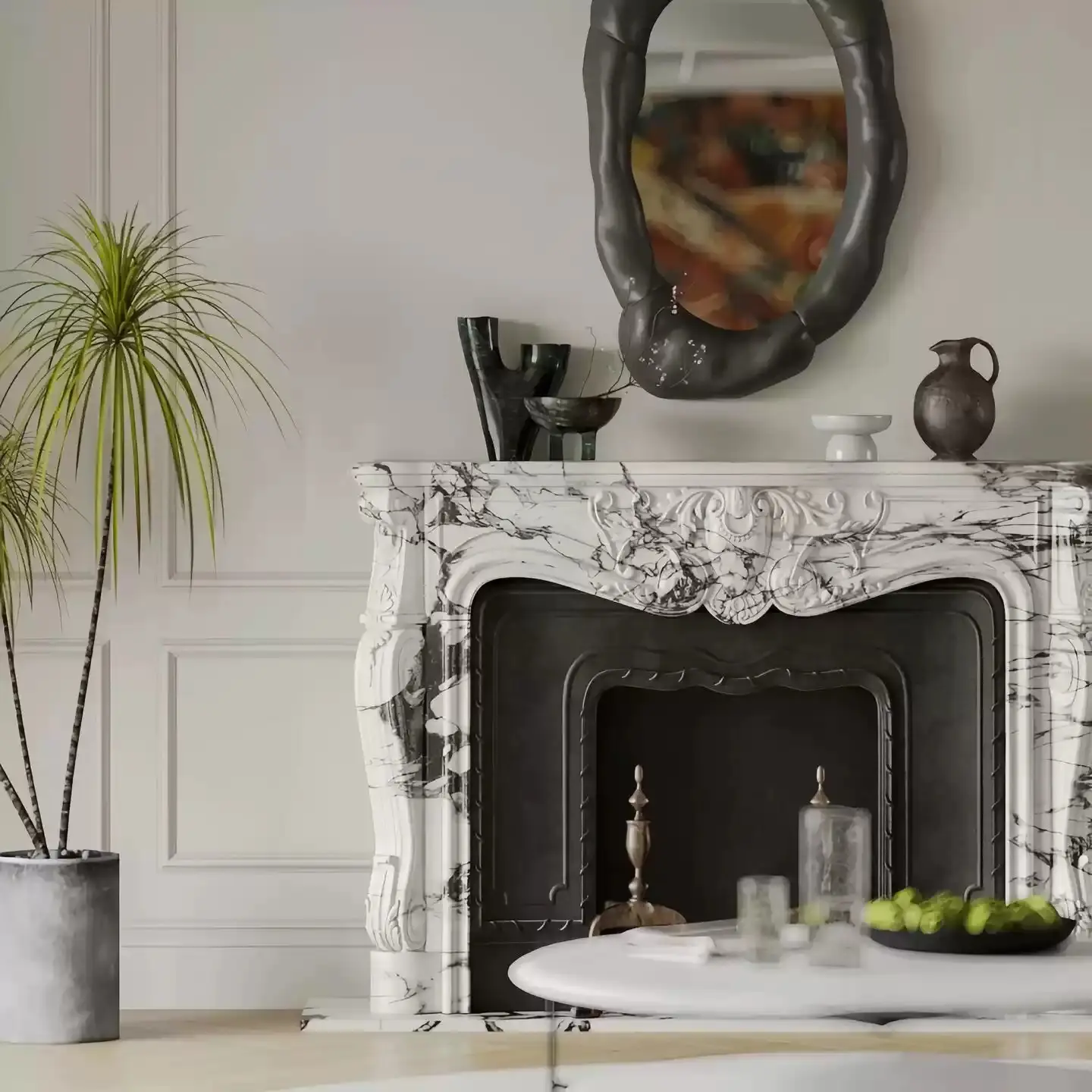 Marble fireplace, large white and black stone, French-style living room, stone-carved fireplace ornaments, European and American-style custom-made decorative cabinets.