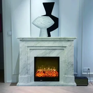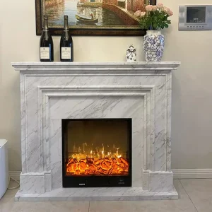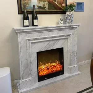 Marble fireplace stone carving in natural jasper white stone, with European decorative patterns, for heating fireplace stand, decorative cabinet, or decorative item.