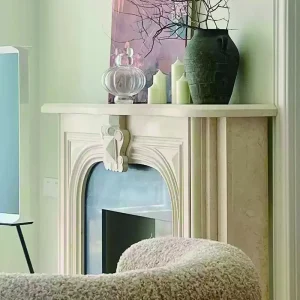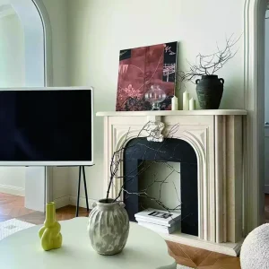 French-style retro living room with marble fireplace, American modern and simple natural large-flower white stone fireplace mantel and decorative cabinet