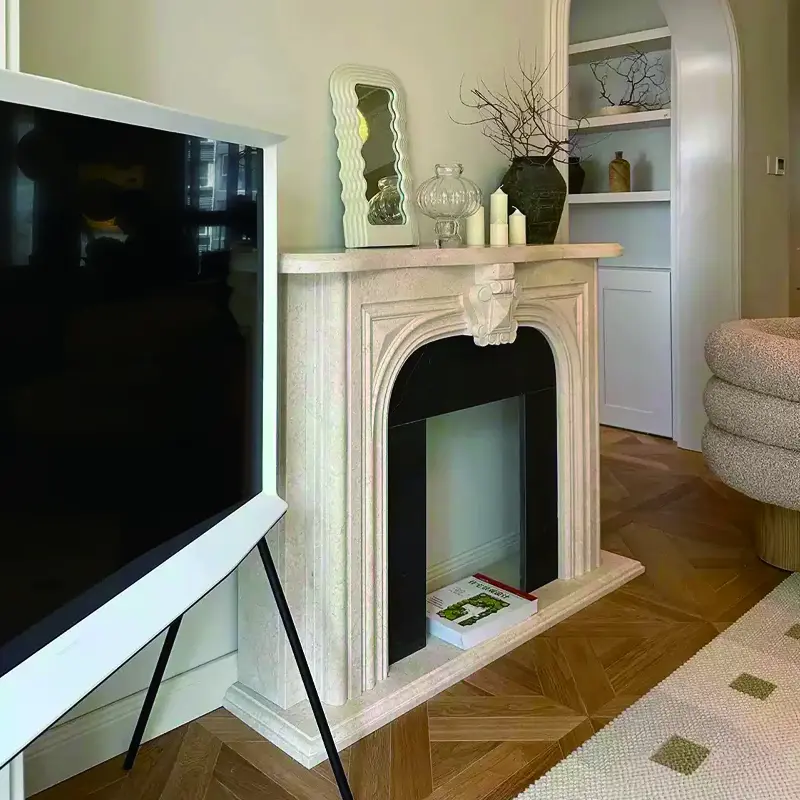 Natural marble Egyptian beige fireplace for living room, stone fireplace, European-American modern minimalist fireplace decorative cabinet