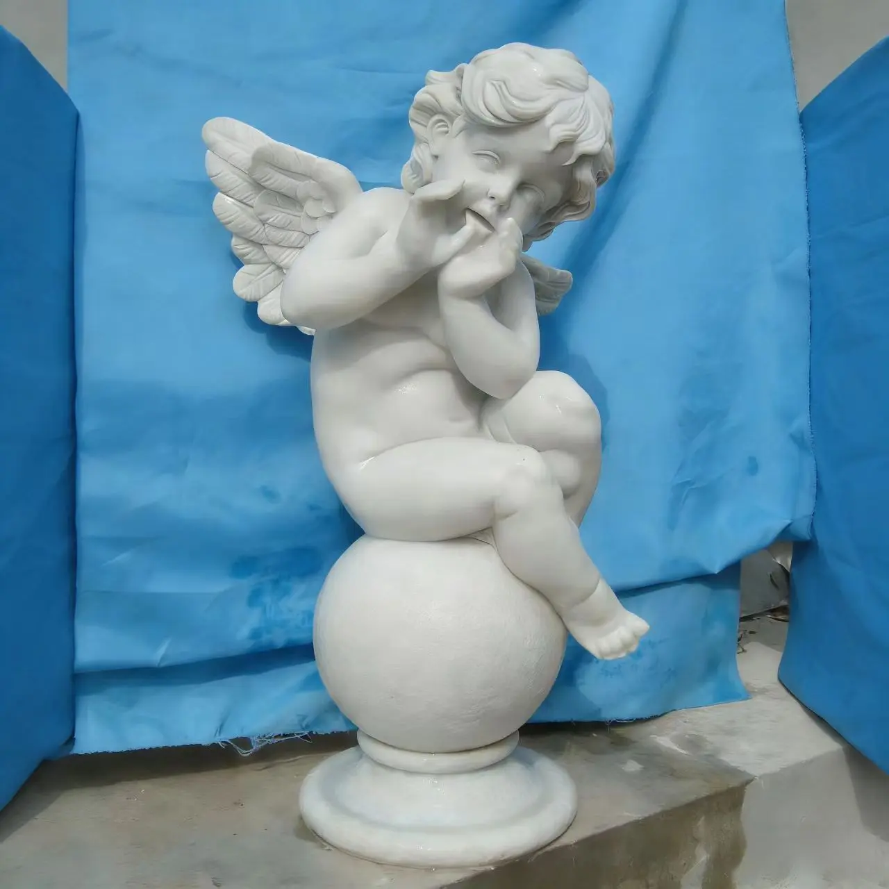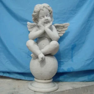 Sculpture Introduction: White Marble Little Angel (Cupid) Ornament This is a European classical style little angel sculpture, often called Cupid or Cupid Angel, and is a classic choice for courtyard and landscape decoration. 🔍 Core features – Materials: The main body is made of natural white marble/marble, and there is also a fiberglass reinforced plastic version imitating stone. It has a fine and white texture, strong outdoor weather resistance, and can be preserved for a long time. – Design: The little angel sits cross-legged on a spherical base, with its hands at its mouth as if playing a flute. The details of its curly hair and wings are vivid. Its posture is playful and cute, full of romantic and childlike charm.